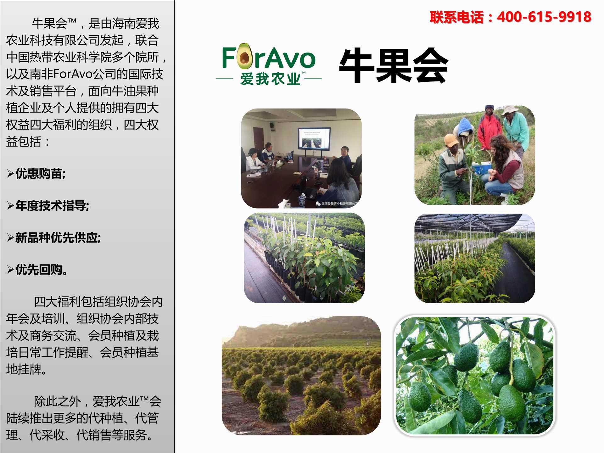 海南愛我農業科技有限公司是一家綜合性的高科技農業發展企業,旗下愛我農業TM致力于打造中國最大最強的牛油果種植企業。依托美國、南非、澳大利亞等擁有百年牛油果繁育、種植歷史以及產業鏈市場的優勢,開展牛油果種苗繁育、種植技術,種植加盟、深加工等產業。結合中國市場,面向廣大苗圃基地、種植農場、合作加工等企業,推出的適合規?;?、標準化的牛油果全產業鏈服務。 Hainan Foravo Agricultural Technology Co., Ltd. is a comprehensive high-tech agricultural development enterprise , dedicated to building the largest and most powerful avocado plantation enterprise in China. Relying on the advantage of avocado nursery, planting history, and the industrial chain over 100 years in the United States, South Africa, Australia, we are carrying out nursery, planting, proce...